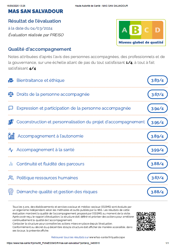 Le secteur Médico-Social de l’Hôpital San Salvadour, dans le cadre de l’évaluation de la qualité des ESSMS, par un organisme extérieur en février dernier, a réussie avec succès cette évaluation.